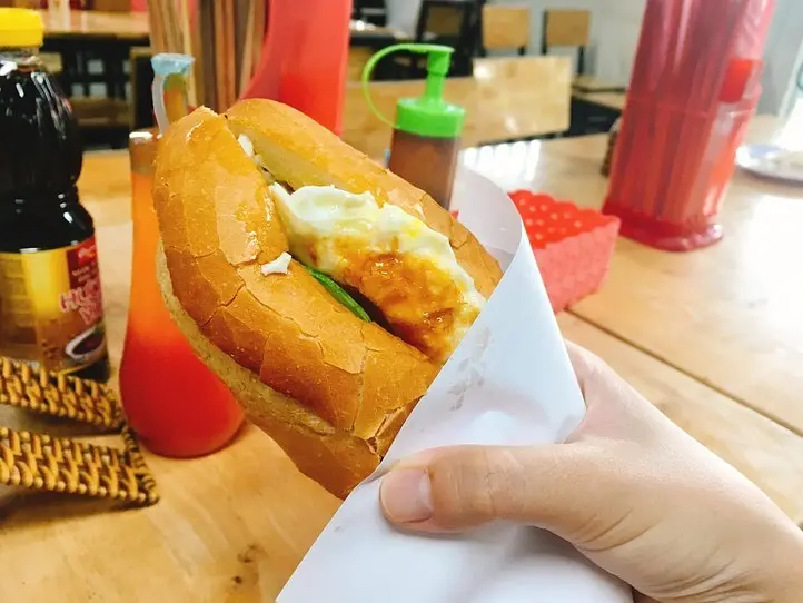 今回はバインミーチュン(卵のバインミー)と、ヌクエップカム(オレンジジュース)を注文しました。