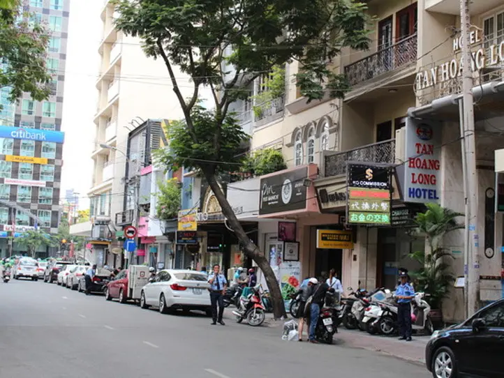 市民劇場を拠点に歩くと、まず雑貨店が並ぶドンコイ通りを東に進んでください。ほどなくしてマックチブオイ通りとの交差点に当たります。左右いずれも雑貨店がありますが、おすすめは右手の方角。中級ホテル、両替商、レストラン、雑貨店、スパ&マッサージ店、オーダーメイド店、コスメ店などがひしめき合っています。