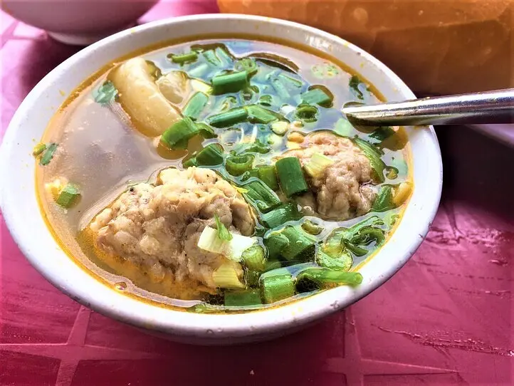 ほぼ透明で、しょっぱいスープに、肉団子がごろごろ。たっぷりのネギと豚の皮も入っています。
