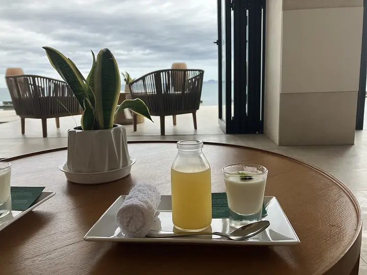 ロビーではウェルカムドリンクをいただきました。サトウキビジュースと、パンナコッタ。これがどちらも感動するおいしさで、序盤からすでに心をもっていかれました(同系列であるミアサイゴンも食事が大変おいしいので、裏切らないな……!と思いました)。
