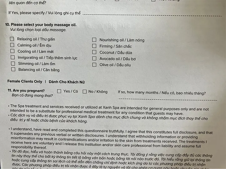 スパの前に、こんな感じで問診票的なものを書きます。好みの匂いや体調などくわしく伝えることができます。