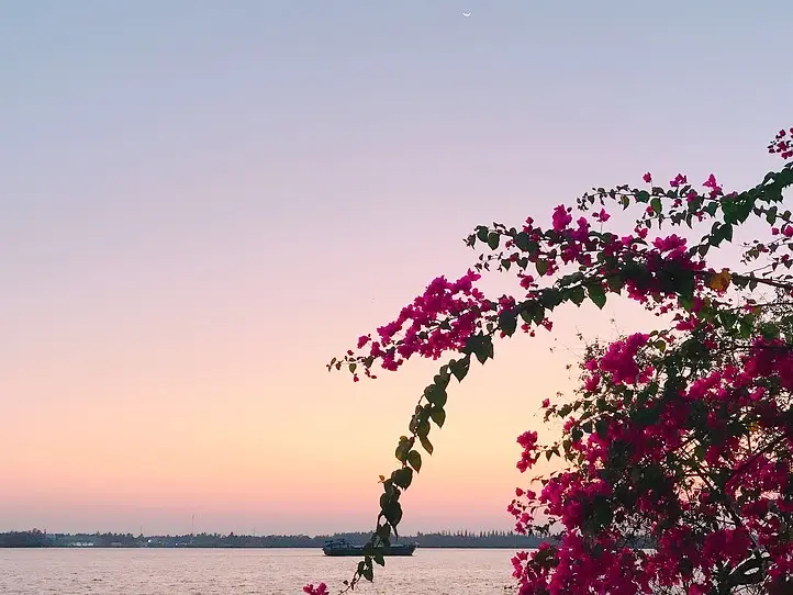 ベンチェからは、メコン川のきれいな風景も楽しむことができます。咲き誇るブーゲンビリアが、トロピカルな雰囲気を醸し出していますね。この日は生憎夕日が雲で見えなかったのですが、茜色に色づいた空を楽しむことができました。