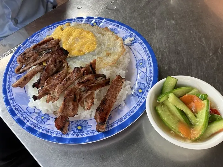 炭火で焼いた甘辛くて濃いめの味付けの豚肉を細切りにして、ごはんにのせた料理。きゅうりやトマトやゆで卵、目玉焼きなどが載っていることもあります。