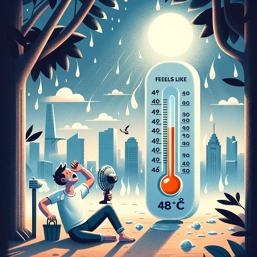 4月の体感温度は、燃えるような熱さ、48°Cに達すると計算されています。熱中症や熱けいれんが予測され、連続した肉体労働には熱中症の危険があります。