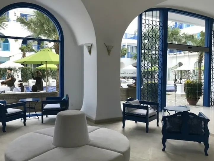 ギリシャのサントリーニ島をコンセプトとしているそうで、建物は白地に涼し気な青色が印象的です。