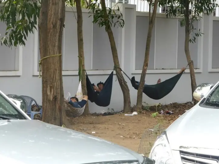 上の写真は、ホーチミン市内のあるお役所の裏側にある空き地での風景。出番待ちのドライバーたちは朝のコーヒーを済ませると、大きな伸びをして車のトランクからハンモックを取り出した。手頃な場所にあるしっかりした木の幹にくくりつけると、携帯電話を片手にさっそくまどろみ始めた。