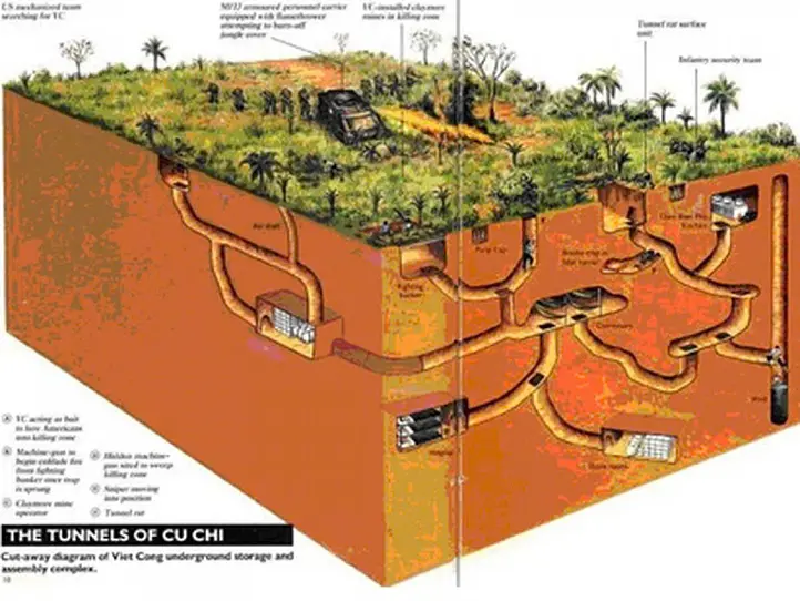 トンネルの総延長は250km以上に及び、その中には居住エリア、医療施設、食料保管庫、さらには作戦会議室までが含まれていました。この巧妙な構造により、ゲリラ部隊は北ベトナム軍と連携し、南ベトナム軍やアメリカ軍に対する効果的な攻撃を行うことができました。また、外部から発見されにくいトンネルの特徴は、ゲリラ戦術において大きなアドバンテージをもたらし、戦局に影響を与えました。