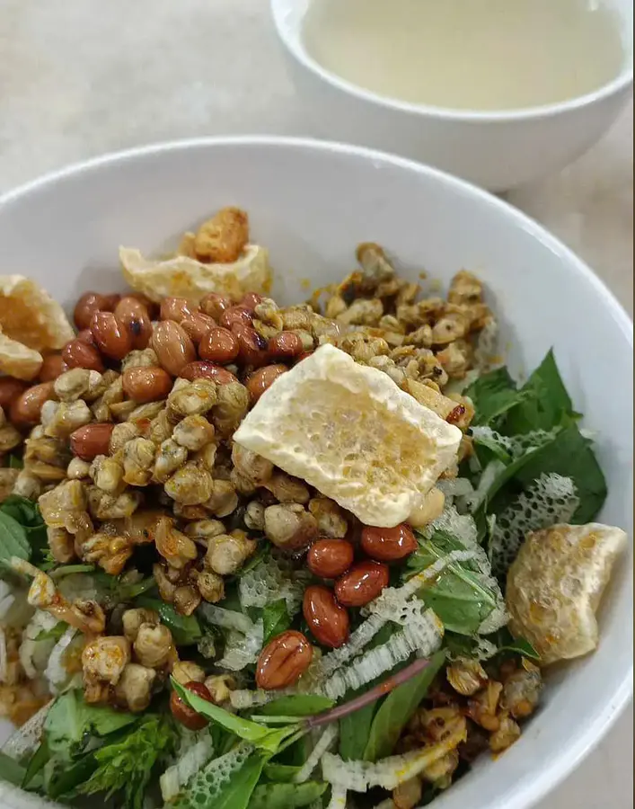 ダナンの名物料理で、ターメリックで黄色く色づいた平打ち麺が特徴。ピーナッツ、エビ、豚肉、香草がトッピングされ、濃厚な甘辛いソースで味わいます。