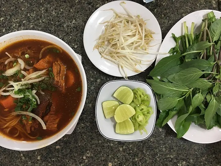 すると注文して割とすぐに出てきました。通常のフォーと同じようにもやし、バジルやパクチーといった葉っぱ類、ライムが机に一緒に並べられました。
