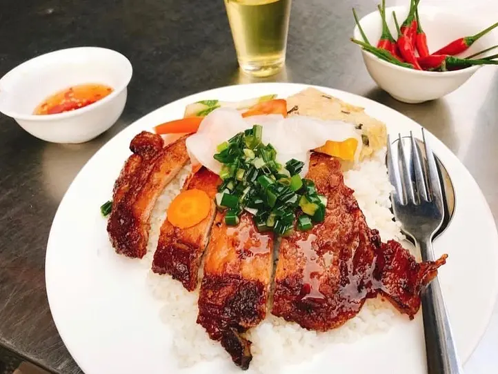 多くの場合、こんなふうにご飯の上におかずを載せて、ワンプレートで持ってきてくれます。こちらは、スペアリブの照り焼き。ベトナム語では、「コムスン」といいます。ベトナム料理では、とってもメジャーな料理の一つです。