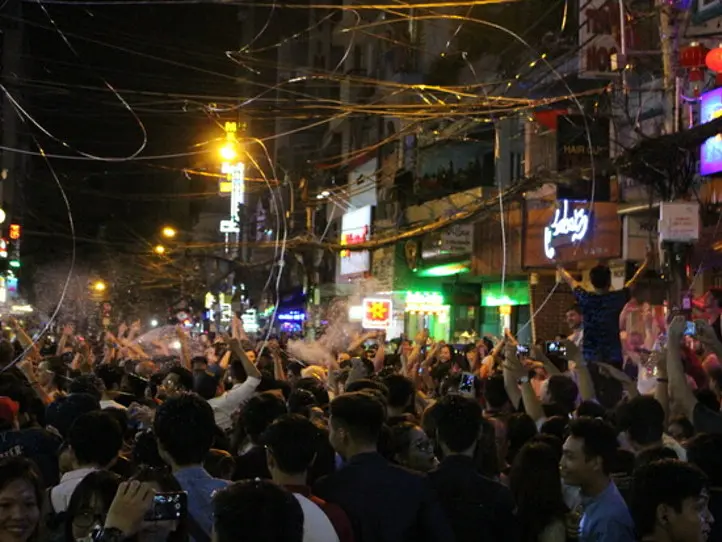 場所はホーチミンのバックパッカー街、ブイビエン通りです。まるでワールドカップで優勝したくらいの盛り上がりでした。では、旧正月もこのような感じかというと、実はそうでもありません。旧正月は伝統深い行事になりますので、多くの人は実家に帰省します。「ヴェー・クエ=田舎に帰る」とベトナム人は漏れなくいいます。逆にホーチミンに残ったり、国内外の旅行をする方は、実家に住んでいる、いわゆる都会っ子です。