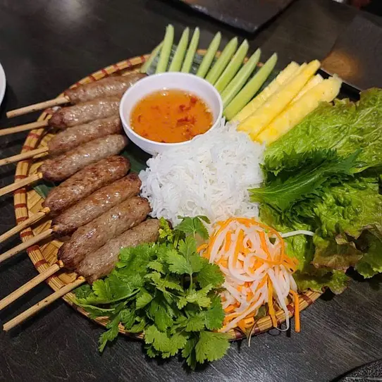 - ネムヌォンの生春巻き (Nem Nuong Cuon Banh Trang): 焼いた豚肉のネムを、新鮮な野菜、キュウリ、青バナナ、マンゴー、ビーフン、そしてライスペーパーで巻いた料理です。タレには魚醤やお店によっては特製のタレを使います。甘い豚肉、さっぱりとした野菜、青バナナやキュウリのほのかな酸味、そして香ばしいタレの風味が絶妙に調和した一品です。