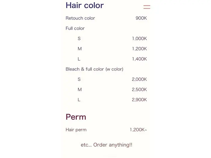 サロンのメニューはこちらです。