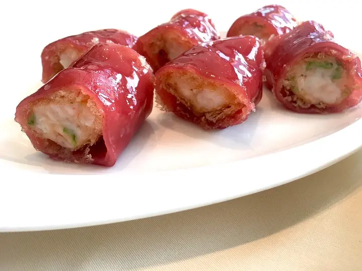 赤い揚げ湯葉巻き。中身はエビ。228,000VND