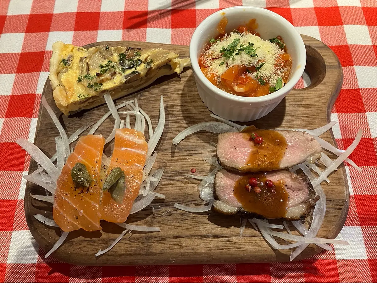 次に前菜4種盛り。サーモン、ラタトゥイユ、お肉、チーズキッシュ。