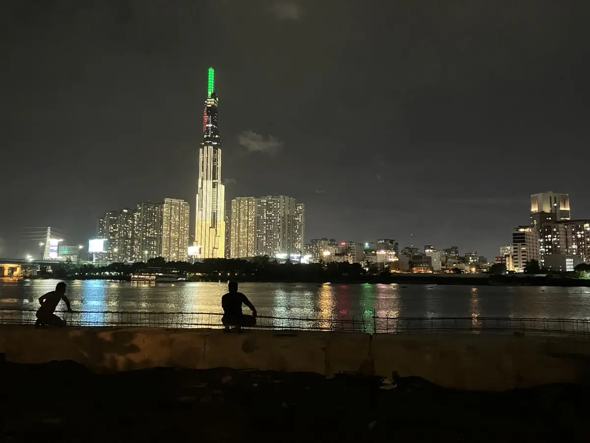 川沿いの席の景色がすばらしいです! ホーチミンのシンボルである、東南アジア1高いビルであるランドマーク81と、それを取り囲むようにたつマンション群、ビンホームセントラルパークがよく見えます。