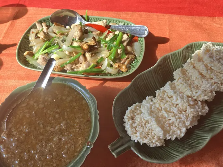 揚げたてのさくさくのあげせんべいに、豚ひき肉、えび、にんにく、ピーナッツなどをミックスしたタレをつけて食べます。やみつきになってしまうおいしさでした。
