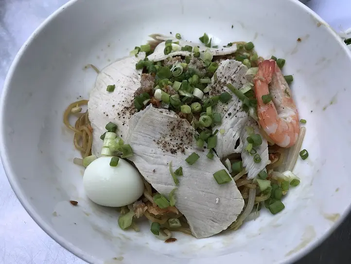 透明なスープの中に、麺とエビや豚肉などの具がのっています。