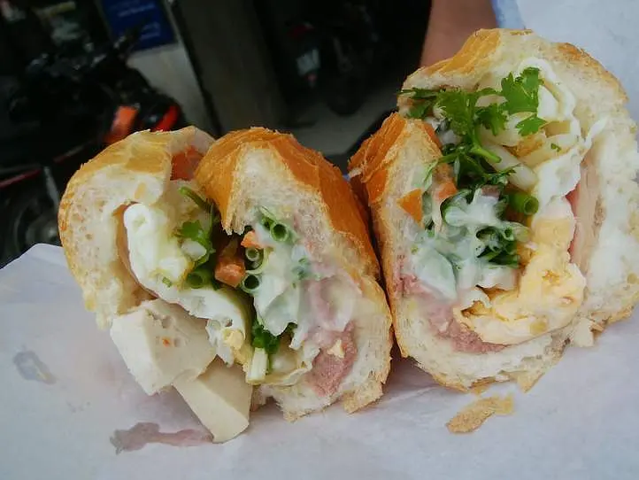 今回私は上から2番目のBa Lac with egg 25,000VND(約125円!)を頼みました。具材を挟む前に軽くパンを炙るのでほっこり温かく、約125円とは思えないボリューム感。中には卵、パテ、ハム、肉、パクチー、キュウリ、なますのような人参と大根、唐辛子、ネギなどの具材がぎっしり。