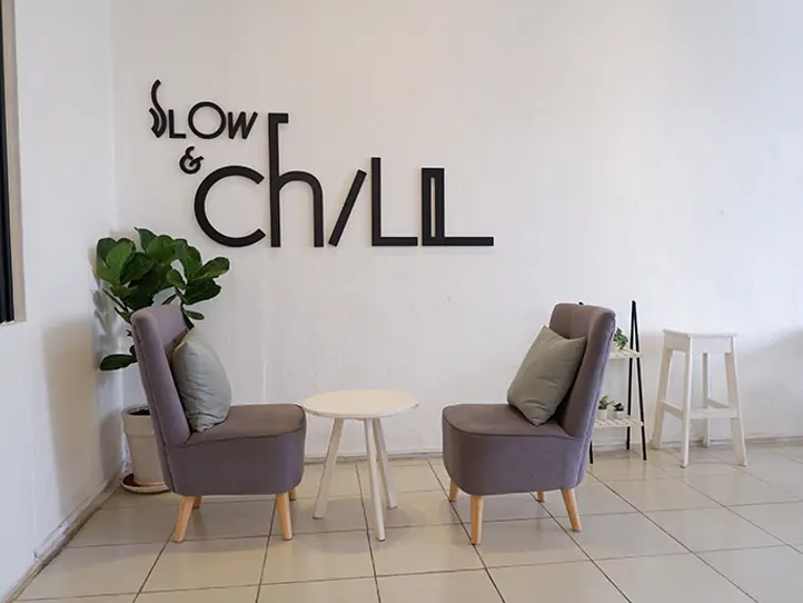真っ白な壁にカラフルなドリンクが写真に映えると人気のカフェ「Slow&Chill Coffe」こちらもテラス席有り。旅行会社の中に入ってから階段で上にあがるため、少し勇気がいりますが、旅行会社の人は気にしていないので、普通に入りましょう。