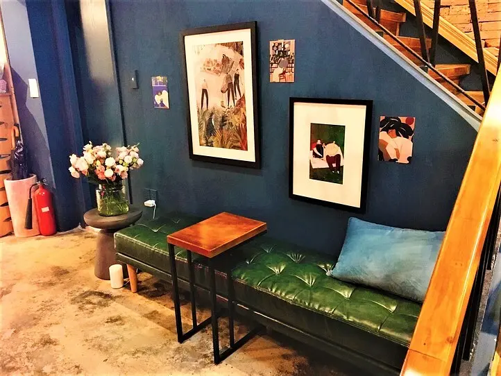なお、看板と同じ、深い青が内装にも使用されていて、とてもシックで落ち着く空間になっています! 二階のバルコニー席に座れば、街を見下ろすことができて気分がよさそうです。
