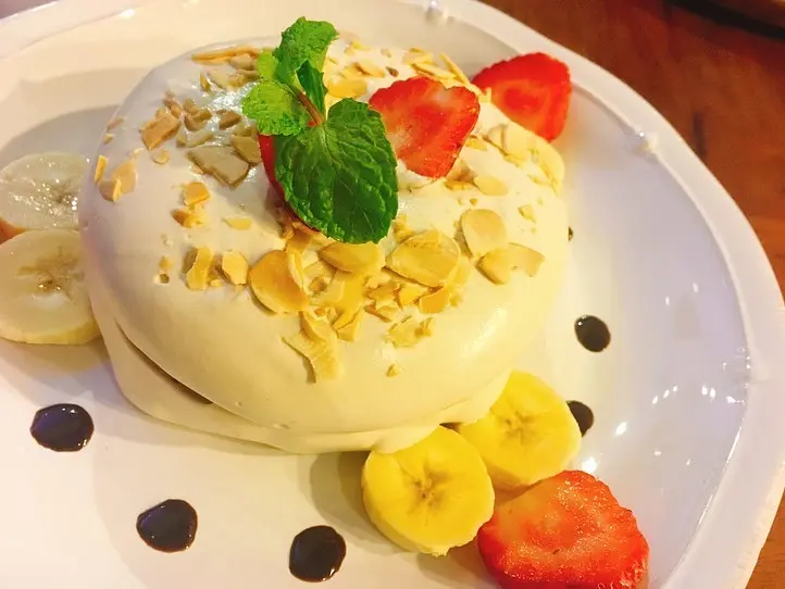 甘くてこってりしたクリームが乗っていてボリュームがあります。がっつり食事した後だと結構多く感じました。ふわふわのパンケーキというより固めのしっかりした生地で、お腹いっぱいになりました。