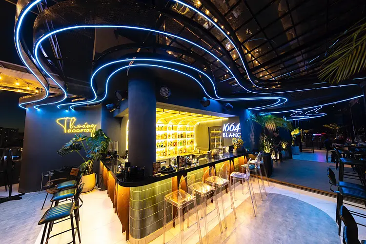 ベトナム語で「風通しが良い」「開放的」を意味する店名「Thoáng(トアン)」の通り、ここはガラスの壁に遮られることのない、自由な空気が流れる場所。心地よい夜風を肌で感じられるオープンエアの空間からは、近代的な高層ビル群と、昔ながらの家々の屋根が織りなす、新旧サイゴンのパノラマビューが広がります。