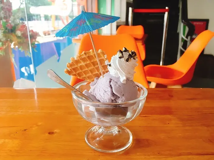 傘をあしらったアイスクリームがとてもかわいく、写真映えもします。アイスはかなり濃厚で、タロ芋の風味もしっかり味わえ、とてもおいしかったです。でも、ポーションが大きめで、ひとつの味だけだとやや飽きるかもしれないので、いろんな味のアイスが載ったものにすればよかったな……と思いました。複数名で来た時は、いろいろ頼んでシェアするのが良いと思います!