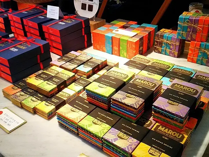 場所は高島屋地下2F。フーコック島特産のペッパーや、ベンチャ産のカカオニブなど、ベトナムの特産品で味つけされた18種類のフレーバーが楽しめます。箱のサイズも6枚・12枚・24枚・40枚入りがあり、個人向けや団体向けに用途に応じた大きさ揃っています。箱のカラーが20色前後から選べるのも嬉しいですね!