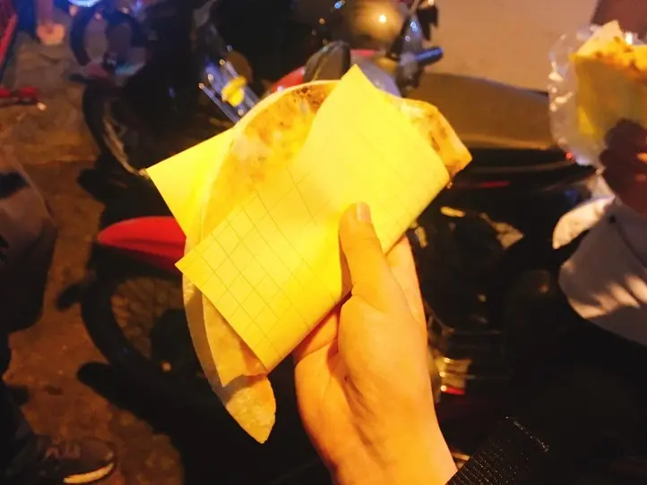ライスペーパーを網などで薄く焼いて、その上にさまざまな具をのせた料理です。軽食やスナック的な位置づけの食べ物で、よく屋台で売られています。