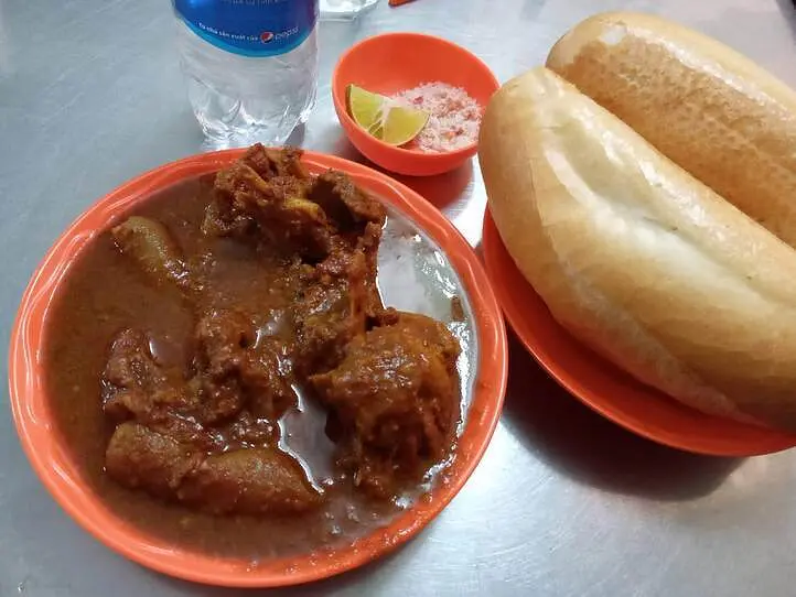 こちらがCa Ri De Nho=ヤギ肉のインドカレー(小)とBanh Mi=パン。カレーはとてもスパイスが効いてピリピリと辛く、辛いのが苦手な方は少し厳しいかもしれませんが、旨味がありとても美味しい!パンは中がふわふわで、カレーにつけながら頂きます。お肉は骨が多くやや食べにくいですが、たっぷりの香辛料で煮込まれているので臭みなどは全くなく、豚肉と鶏肉の間のような食感です。お肉を食べたい方は焼きヤギ肉など追加された方が良いかもしれません。ヤギのおっぱいもおすすめです。