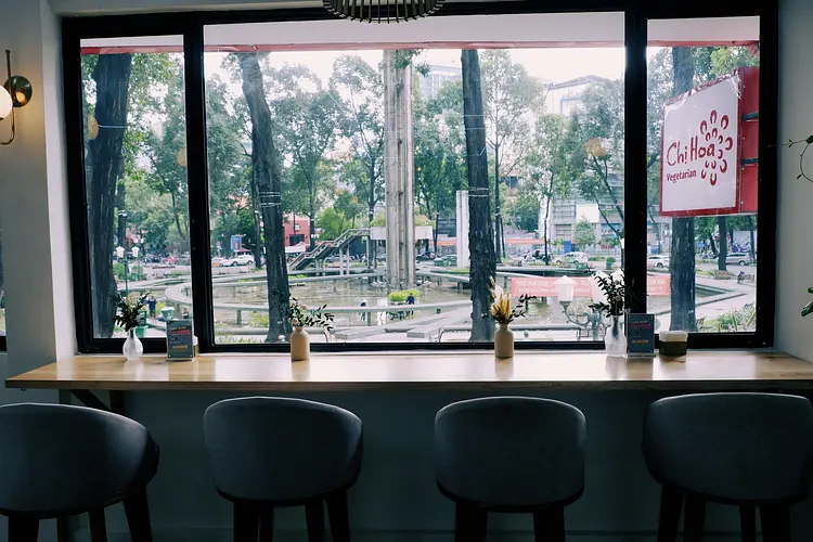 新しく広々とした、若々しい雰囲気でありながら、温かみのある空間で、Chị Hoaは繁忙なサイゴンの中で、静かで清らかなベジタリアンの食事を提供します。
