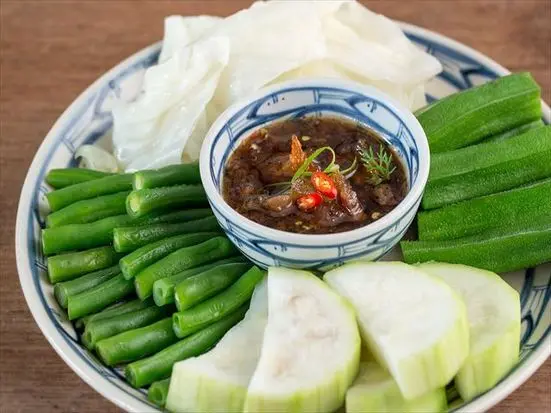 蒸した野菜を特製のつけダレにつけて食べます。こちらも家庭や食堂で食べられる料理