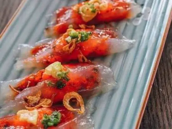エビのすり身が入った半透明のもっちり食感。バインベオに続くフエ料理の名物です。