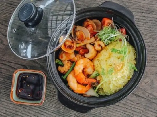新鮮な魚介とフエチャーハンを添えた一品。しっかりとした味付けが特徴は万人受けします。