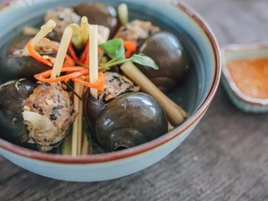 いわゆるカタツムリ。フランスでは高級食材ですね。渦巻殻の中に香味づけした肉団子を詰めています。