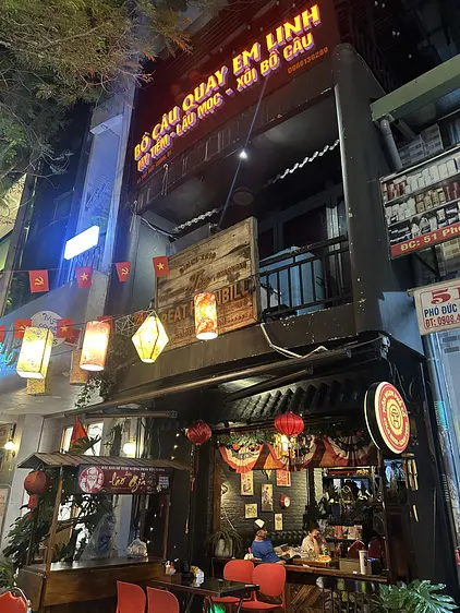 店では常に新鮮な鳩を使用し、最適な温度と時間で完璧に焼き上げています。その結果、皮は黄金色に輝き、一口噛むとパリッと音を立てる一方で、中の肉は柔らかく、ジューシーで、自然な甘みが完全に保たれています。この料理は、店の特製である酸味、甘味、辛味のバランスが取れたつけダレと一緒にいただくことで、忘れられない味覚体験となります。中心部にありながらも、エム・リンは素朴で庶民的な雰囲気を保ち続けており、本物のサイゴン屋台料理を体験したい地元客や観光客を魅了しています。