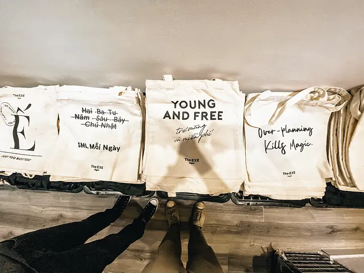 地元の若者にとって、The E.Y.E Saigon のトートバッグは「必須アイテム」。シンプルでありながら独創的で、ライフスタイルそのものを象徴する存在となっています。