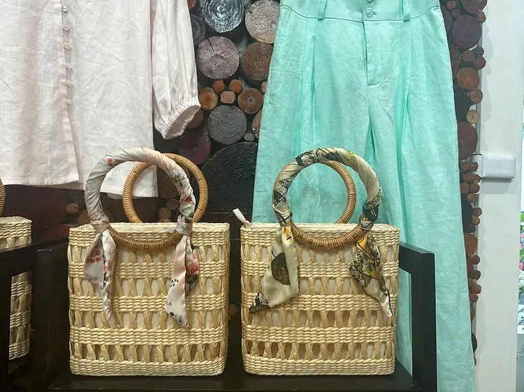 持ち手のスカーフが上品なアクセント。大人のリゾートスタイルにぴったりなバッグです。