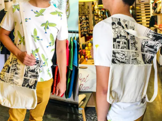 カンバス素材。ショルダーバッグ、もしきはリュックタイプと気分で選べる2WAY。イラストはもちろんベトナムの伝統・習慣に因んだもの