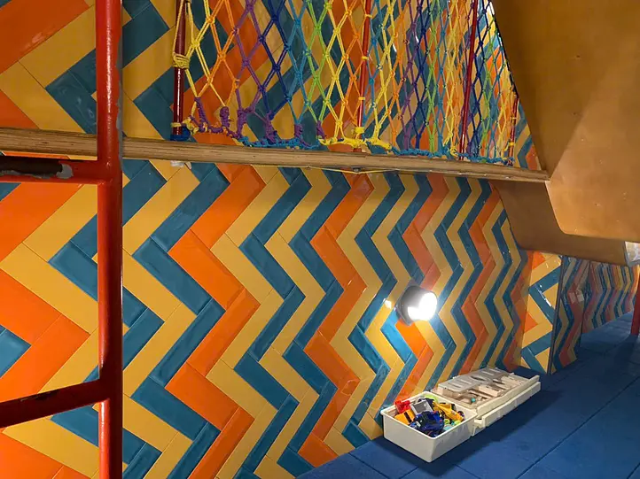 キッズスペースは入ってすぐのダイニングエリアの後ろ側にあり、幅は少し細いですが高さがあり3段になっているので、登ったり下りたり、結構しっかり遊べると思います。