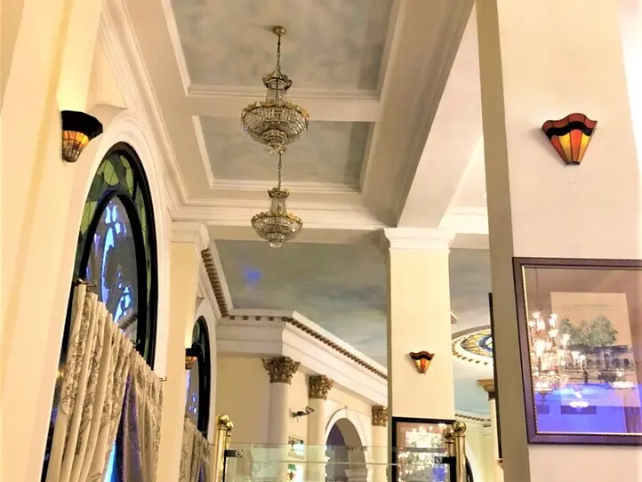 建築の際は多くの資材がヨーロッパ、とくにフランスから持ち込まれたそうで、バルコニーはフレンチ様式で作られていますが、蓮の彫刻がほどこされるなど、屋根は東洋式となっています。内部は豪華なアンティークが揃っていると言われています。