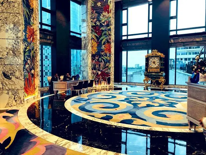 ここもまたとんでもない景色で……。無地のところがほぼない。すべてが柄で埋め尽くされ、ツルッツルの大理石や鏡がその柄を反射し、目がおかしくなりそう。