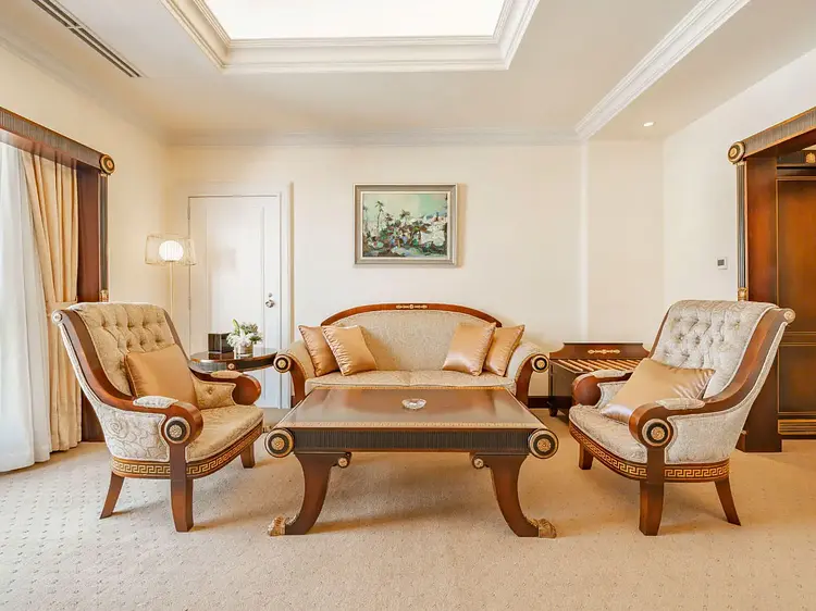 デラックススイートは、洗練された現代的なデザインと上質なインテリアが魅力のお部屋です。広々とした客室には、ゆったりとしたキングサイズベッドのほか、快適なソファが備えられたリビングスペース、そして高級アメニティを備えたモダンなバスルームが完備されています。