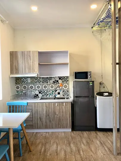 キッチンが大きいのと、電子レンジ、冷蔵庫、洗濯機があるのもポイントが高かったです。ベトナムでは洗濯機が個々の部屋になくて、共用の洗濯機を使うことも多いのですが、自室の洗濯機をつかって、ベランダに干すというように自室で完結できるのがよかったです。