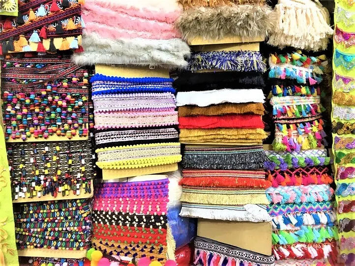 チロリアンテープ、タッセル、レースなどがたくさんぶらさがっています。最低2mから買えるようです。1本2mで、20,000VND~40,000VNDでした。日本よりかなり安いですね。たくさんありすぎて迷ってしまいますが、迷ったら全部買ってもいいぐらい安いです。
