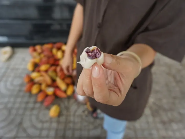 こちらでは、チョコレートができるまでの工程を見学させてもらうことができます。生のカカオの実。