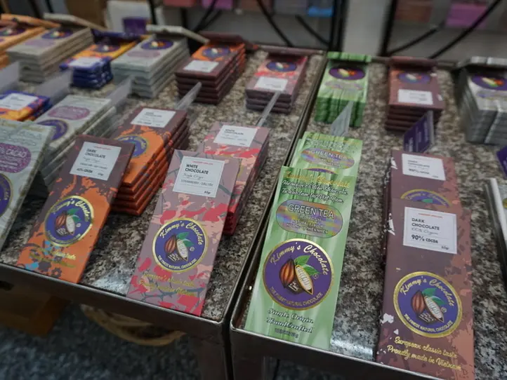 ベトナムに来て、チョコレート工場!?と思う方も多いかと思います。カカオの生産といえば、コートジボワールやガーナなどが一般的ですが、実はベトナムもカカオの生産に適した気候にあります。生産量は少ないのですが、近年では美味しいと価値が高まり、チョコレートの生産が増えています。そしてホーチミン土産の定番になっています。