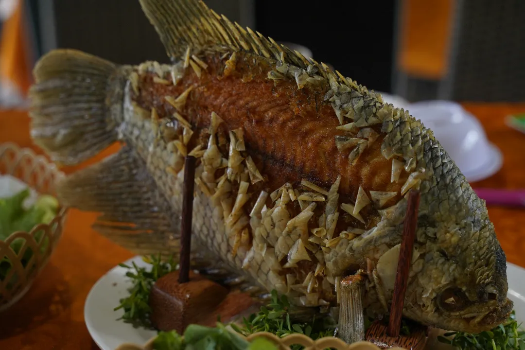 プライベートカーのツアーでは、メコン地域の名物料理、象耳魚(エレファントイヤー・フィッシュ)や揚げ風船餅(ソイチェンフォン)がメニューに含まれているだけではなく、その他の料理もお楽しみいただけます。